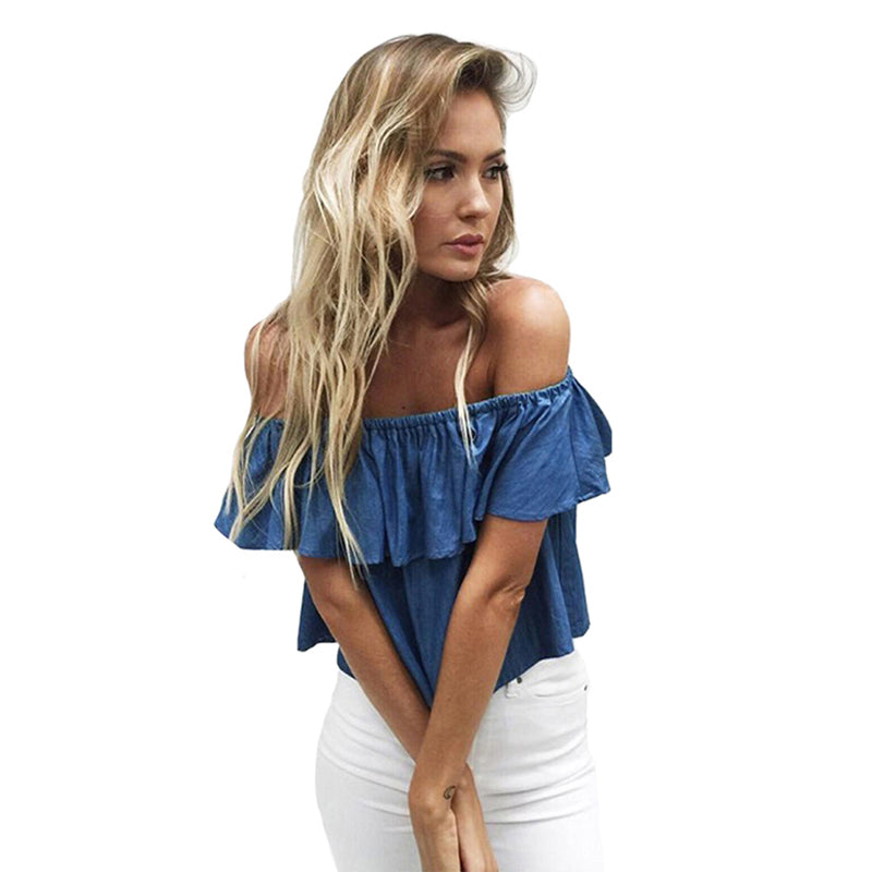 Sexy Strapless Slash Neck Plus Size Ruffles Loose Denim Blouse