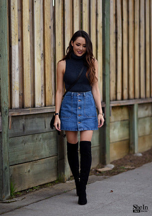 Mini High Waist Sexy A-Line Pockets Blue Single Breasted Denim Skirt