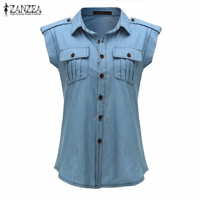 Vintage Buttons Pockets Sexy Sleeveless Denim Shirts